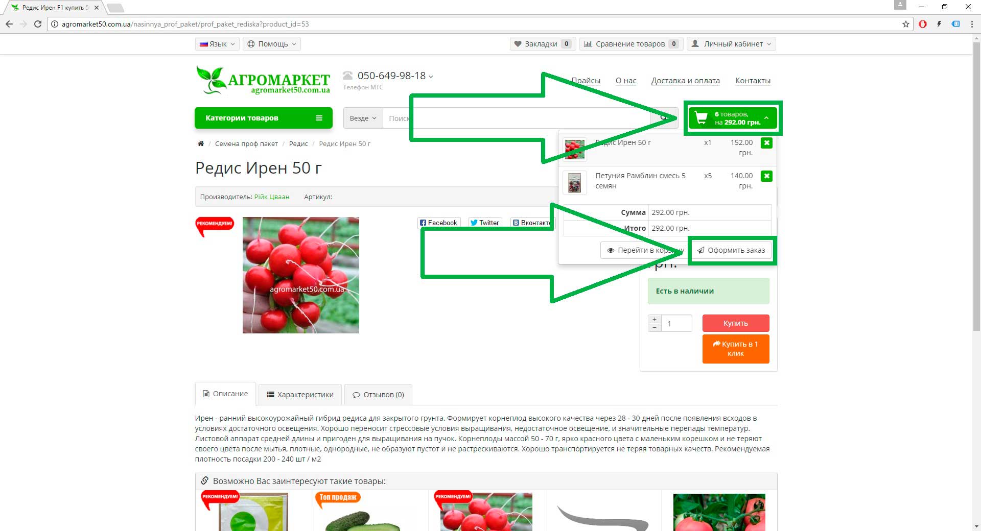 2. После того как Вы добавили кнопкой «Купить» все необходимые товары, нужно нажать на пиктограмму корзины и нажать на кнопку «Оформить заказ» (как показано на скрин шоте).