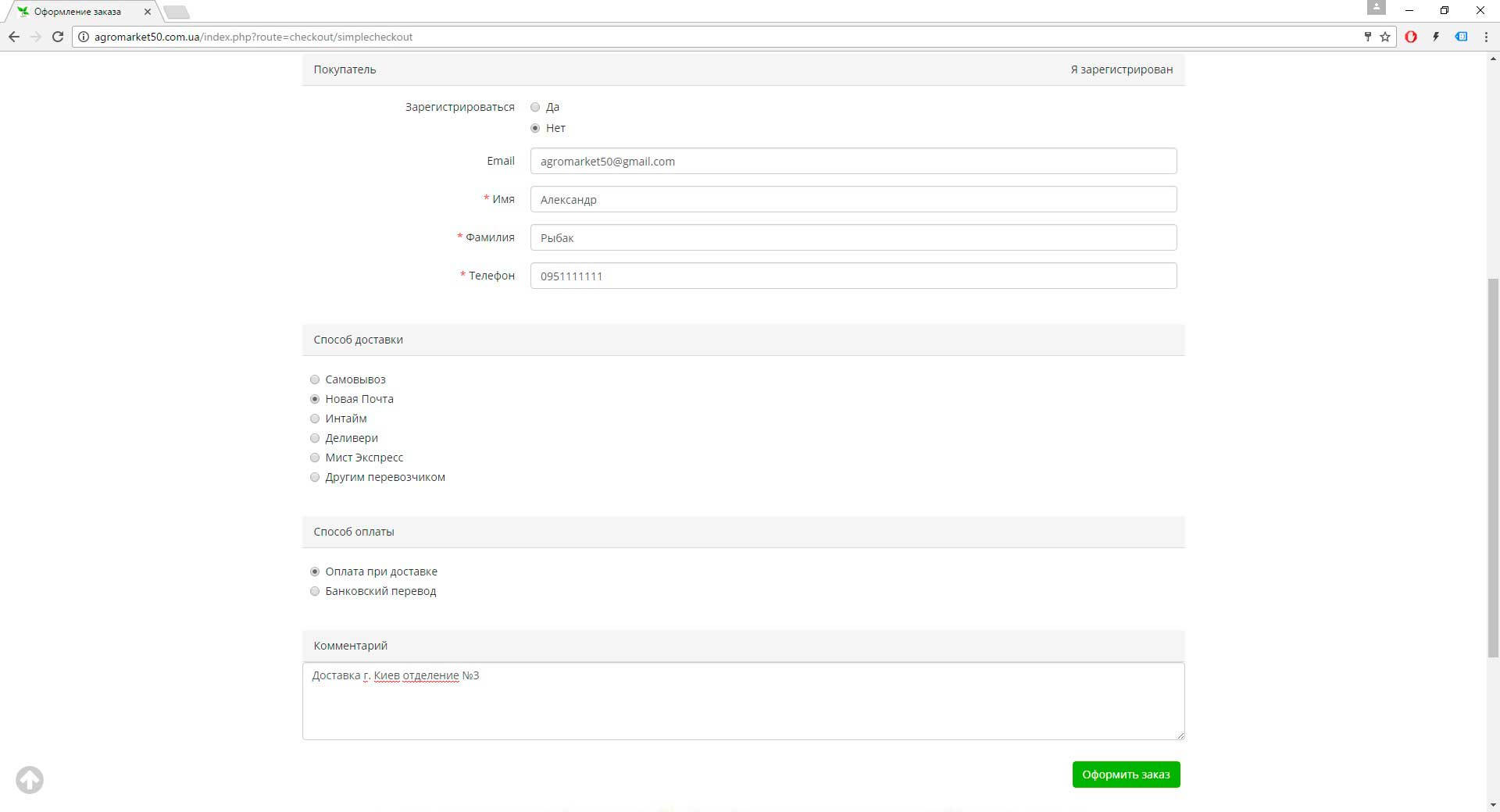 4. Если вы выбрали не регистрироваться, то укажите пожалуйста контактные данные, способ доставки и способ оплаты, а также оставьте комментарий по желанию, после чего нажмите на кнопку «Оформить заказ». После оформления заказа мы обязательно позвоним Вам для уточнения заказа.