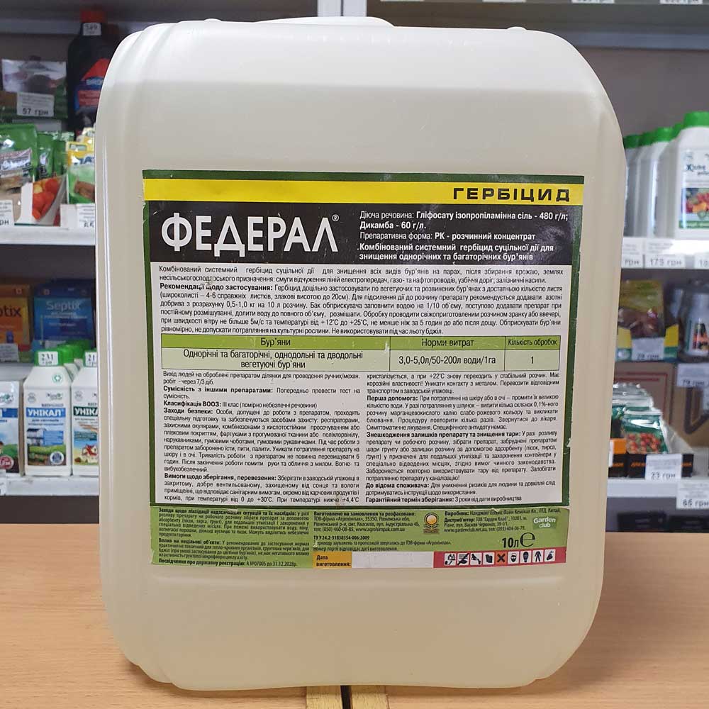 Гербіцид суцільної дії Федерал 10 лДіюча речовина: гліфосату ізопропіламінна сіль (480 г/л) + дикамб..